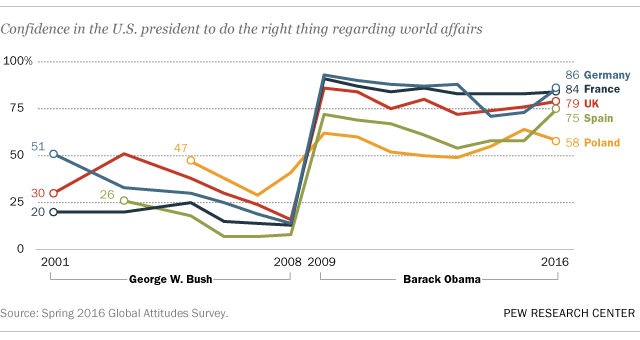 Obama’s election quickly elevated America’s image abroad, especially in Europe, where George W. Bush was deeply unpopular following the U.S. invasion of Iraq. In 2009, shortly after Obama took office, residents in many countries expressed a sharp increase in confidence in the ability of the U.S. president to do the right thing in international affairs. While Obama remained largely popular internationally throughout his tenure, there were exceptions, including in Russia and key Muslim nations. And Americans themselves became more wary of international engagement.