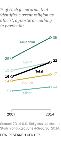 When it comes to the nation’s religious identity, the biggest trend during Obama’s presidency is the rise of those who claim no religion at all. Those who self-identify as atheists or agnostics, as well as those who say their religion is “nothing in particular,” now make up nearly a quarter of the U.S. adult population, up from 16% in 2007.