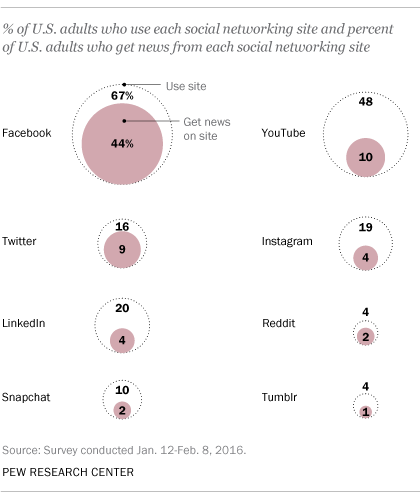 In 2016, more U.S. adults learned about the presidential election through social media than through print newspapers. Younger Americans, in particular, were more likely to turn to social media rather than more traditional platforms, with those ages 18 to 29 listing it as their “most helpful” source for election information in a January 2016 survey. (Cable TV, by contrast, remained among the most helpful sources for all other adults.)