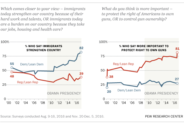 Gun control has long been a partisan issue, with Democrats considerably more likely than Republicans to say it is more important to control gun ownership than protect gun rights. But what was a 27-percentage-point gap between supporters of Obama and John McCain on this question in 2008 surged to a historic 70-point gap between Clinton and Trump supporters in 2016.