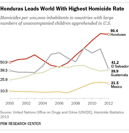 The Honduran and Salvadoran child migrants are from some of the most violent regions in those countries. San Pedro Sula in Honduras is the world’s murder capital, with a homicide rate of 187 homicides per 100,000 inhabitants in 2013 driven by a surge in gang and drug trafficking violence. For the entire country Honduras’s murder rate was 90 per 100,000 in 2012, the highest in the world. In 2011, El Salvador was not far behind, at 70, ranking second in terms of homicides in Latin America then. Even with a significant drop in the murder rate from 70 in 2011 to 41 in 2012, El Salvador is only surpassed by Honduras, Venezuela and Belize in the entire world.