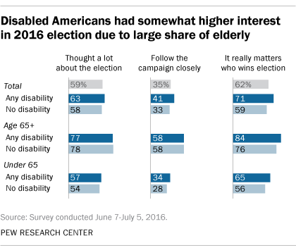 Disabled Americans were politically engaged in the 2016 presidential election. In a survey conducted in the early summer of 2016, about seven-in-ten (71%) Americans who self-identified as disabled said it “really matters who wins the election,” compared with 59% of Americans who did not report having a disability. Disabled Americans were also more likely to follow the campaign closely than those without a disability. These findings are from the Center’s American Trends Panel, which found that 22% of American adults self-reported living with a disability in 2016, defined as a “health problem, disability, or handicap currently keeping you from participating fully in work, school, housework, or other activities.”