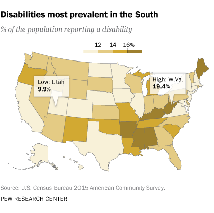 Some states, counties and cities are more likely than others to have residents with a disability. West Virginia had the highest share of any state, at 19.4%. In Arkansas, Kentucky and Alabama, about 17% said they had a disability. In contrast, Utah was among the lowest, with 9.9% of the population reporting a disability in 2015.