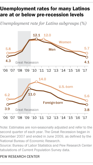 Hispanics born in the U.S. have made the most progress on this measure, with the group’s unemployment rate dropping to below its pre-recession level – 5.6% in the second quarter of 2017, compared with 6.2% in 2006. By comparison, foreign-born Hispanics’ unemployment rate in 2017 (3.8%) had only returned to its pre-recession level.
