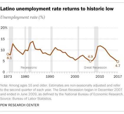 The Hispanic unemployment rate stood at 4.7% in the second quarter of 2017, about the same as in the second quarter of 2006 (4.9%). The improving labor market prospects for Latinos mirror trends for U.S. workers overall. The national unemployment rate in the second quarter of 2017 was 4.2%, compared with 4.6% in the second quarter of 2006. (Estimates are non-seasonally adjusted, but seasonally adjusted data show the same trend.)