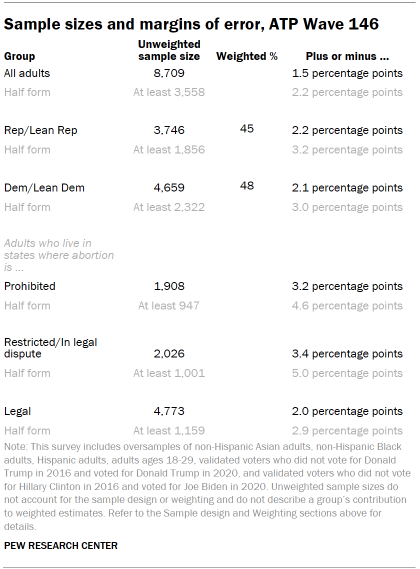 Data in this report is drawn from ATP Wave 146, conducted from April 8 to 14, 2024. It includes oversamples of non-Hispanic Asian adults, non-Hispanic Black adults, Hispanic adults and adults ages 18 to 29 in order to provide more precise estimates of the opinions and experiences of these smaller demographic subgroups. It also included an oversample of validated 2016 and 2020 “vote switchers” who voted for Donald Trump in 2020 but not in 2016 or who voted for Joe Biden in 2020 but not for Hillary Clinton in 2016. These oversampled groups are weighted back to reflect their correct proportions in the population. A total of 8,709 panelists responded out of 9,527 who were sampled, for a response rate of 91%. The cumulative response rate accounting for nonresponse to the recruitment surveys and attrition is 3%. The break-off rate among panelists who logged on to the survey and completed at least one item is less than 1%. The margin of sampling error for the full sample of 8,709 respondents is plus or minus 1.5 percentage points.
