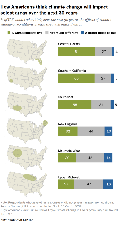 Majorities expect that coastal Florida (61%), Southern California (60%) and the Southwest (55%) will become worse places to live over the next 30 years because of the effects of climate change.