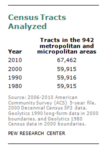 In the 2010 ACS five-year data (available on the Census Bureau’s American Fact Finder), there are 73,057 census tracts in the 50 states and District of Columbia. For 2010 this analysis examined the 67,462 census tracts in metropolitan and micropolitan areas. For 1980 to 2000 the analysis does not examine the same 67,462 census tracts. As the population grows over time, the Census Bureau delineates more census tracts so the number of census tracts grows across censuses. However, the 942 metropolitan and micropolitan areas are composed of counties. Counties change very little across censuses. For the earlier years, the tracts in the same counties that were analyzed in 2010 are included in the analysis. So though we are not analyzing a constant number of census tracts, we are analyzing uniformly the tracts in the counties that comprise the 2010 metropolitan and micropolitan areas.