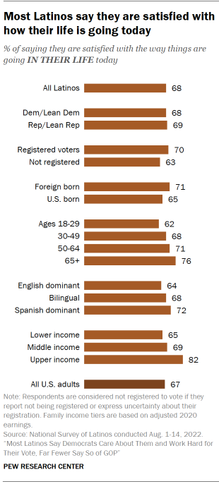 Meanwhile, 76% of Latinos older than 65 say they are satisfied with their life, a greater share than among those ages 18 to 29 (62%) and ages 30 to 49 (68%).