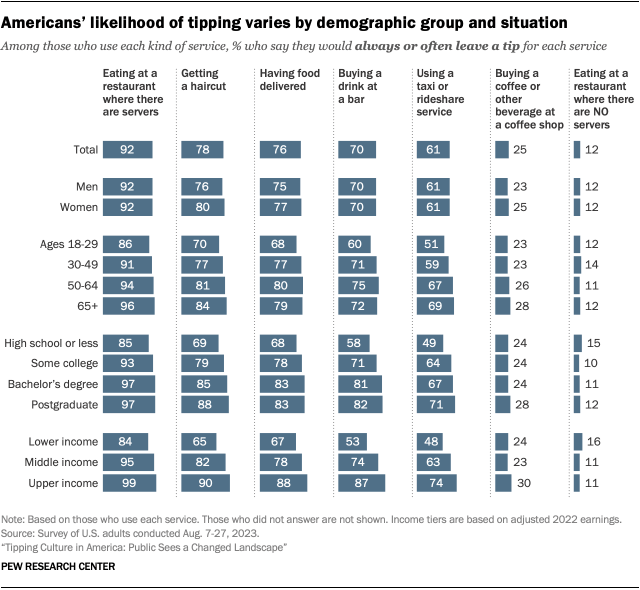 Report | November 9, 2023 Tipping Culture in America: Public Sees a Changed Landscape Appendix: Detailed tables X Facebook Threads LinkedIn WhatsApp Mail Print Add Us On Google By Drew DeSilver and Jordan Lippert Table of Contents Tipping Culture in America: Public Sees a Changed Landscape 1. How Americans feel about the basics of tipping 2. How Americans see recent developments in tipping 3. Services Americans do and don’t tip for – and how much 4. Factors affecting whether and how much Americans tip Acknowledgments Methodology Appendix: Detailed tables ← Prev Page 1 … 3 4 5 6 7 8 Next Page → ToplineReport PDF