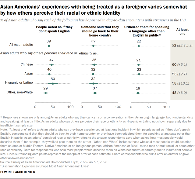 Asian Americans’ perceived racial or ethnic identity is also associated with whether they are treated as foreigners in day-to-day encounters: