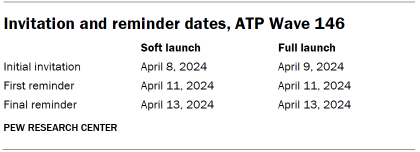 The data collection field period for this survey was April 8 to 14, 2024. Postcard notifications were mailed to a subset of ATP panelists with a known residential address on April 8.4