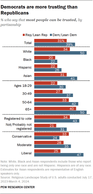 Self-described liberal Democrats express more trust (with 47% saying most people can be trusted) than Democrats who describe themselves as ideologically moderate (35%) or conservative (24%).