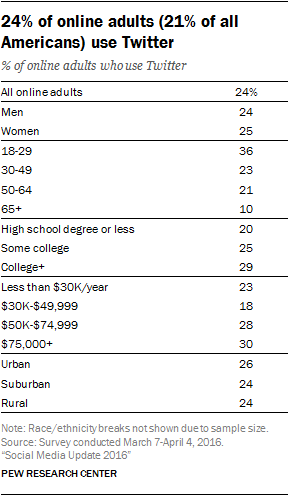 Roughly one-quarter of online adults (24%) use Twitter, a proportion that is statistically unchanged from a survey conducted in 2015 (23%).