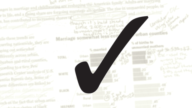 It’s called a number check, but we check much more than the numbers. Apart from verifying that the numbers cited in our writing or associated charts are correct, we ask ourselves other questions, too: Are we describing the numbers in a way that’s accurate and fits with the narrative? Are the claims we make, such as calling something a “majority,” statistically significant? Are we leaving out any keys to understanding the data, such as a definition of the survey “universe”? Is our writing biased or misleading in any way? Will it be understood by our audience?