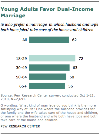 Young adults are often at the forefront of changing social norms. Adults younger than 30 are most likely to favor a dual-income marriage model (72%), over the breadwinner husband-homemaker wife model (22%). This is even more true for young women, who are more likely than young men to prefer dual-income marriage (78% vs. 67%). Young adults are also more positive about the impact on families of increasing numbers of women entering the workforce.