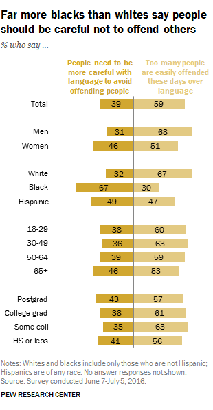 July 20, 2016 In ‘political correctness’ debate, most Americans think too many people are easily offendedFar more blacks than whites say people should be careful not to offend others