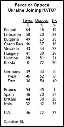 Similar to their support for Ukraine’s accession into the EU, majorities in Poland (64%), Lithuania (58%) and France (54%) favor Ukraine’s joining NATO in the next decade. On balance, there is support for Ukraine’s entry into NATO among Bulgarians (49%), Czechs (46%), the Spanish (46%), the British (44%), Slovaks (43%), and Hungarians (41%). In several of these nations, however, relatively large percentages do not offer an opinion. That includes 34% in Spain, 29% in Hungary and 28% in Bulgaria.