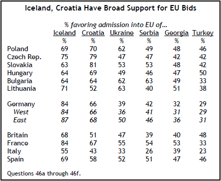 Looking to the future, there is support among the EU member states surveyed to admit Iceland and Croatia into the organization in the next decade – but there is widespread opposition to Turkey’s bid for membership.