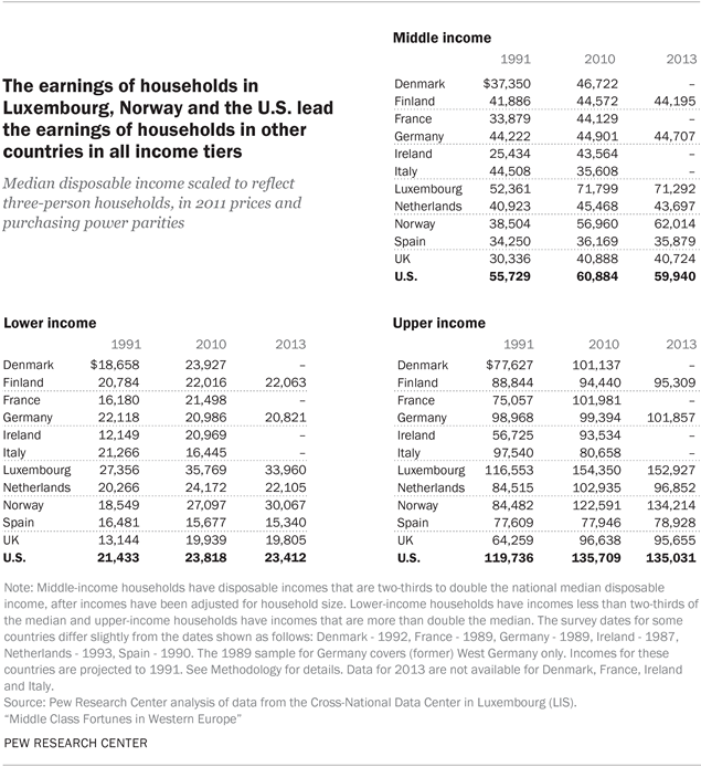 The charts in this appendix present estimates through 2013 for the distribution of adults across lower-, middle- and upper-income tiers and estimates of the incomes of households in each tier. Data for 2013 are available for the following eight countries: Finland, Germany, Luxembourg, Netherlands, Norway, Spain, the United Kingdom and the United States.