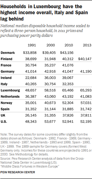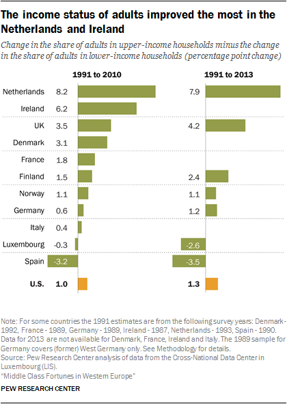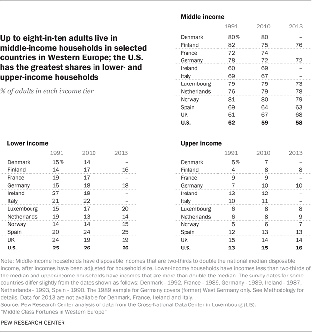The charts in this appendix present estimates through 2013 for the distribution of adults across lower-, middle- and upper-income tiers and estimates of the incomes of households in each tier. Data for 2013 are available for the following eight countries: Finland, Germany, Luxembourg, Netherlands, Norway, Spain, the United Kingdom and the United States.