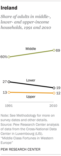 The charts in this appendix show the shares of adults in the lower-, middle- and upper-income tiers in a country in 1991 and in the latest year for which data are available. The latest estimates for Denmark, France, Ireland and Italy are for 2010. The latest estimates for Finland, Germany, Luxembourg, the Netherlands, Norway, Spain, the UK and the U.S. are for 2013.