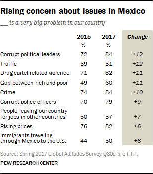 In 2017, crime, political corruption, drug cartel-related violence and rising prices are the top concerns for Mexicans. More than seven-in-ten also view corrupt police officers and a lack of employment opportunities as very big problems. Concerns have risen since 2015 for nine of 12 issues tested. The shares of Mexicans who named corrupt political leaders, cartel-related violence, the gap between rich and poor, crime and traffic each rose by 10 points or more over the past two years.