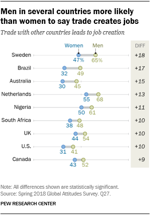 Gender also plays a role in such sentiment. In nine of 27 nations, men are more likely than women to believe that trade creates jobs. This includes an 18-point gender gap in Sweden, a 17-point differential in Brazil and a 15-point divide in Australia.