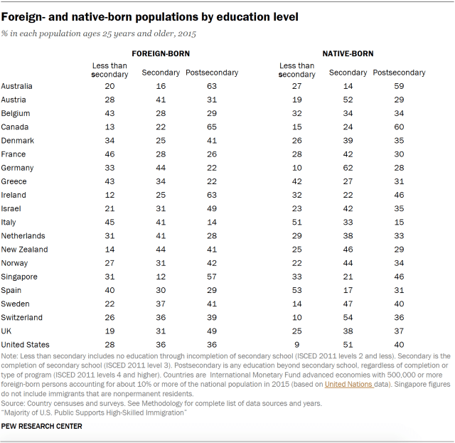 Report | January 22, 2019 Majority of U.S. Public Supports High-Skilled Immigration Appendix B: Detailed demographic tables X Facebook Threads LinkedIn WhatsApp Mail Print Add Us On Google By Phillip Connor and Neil G. Ruiz Table of Contents Majority of U.S. Public Supports High-Skilled Immigration Acknowledgements Survey methodology Educational attainment methodology Appendix A: References Appendix B: Detailed demographic tables ← Prev Page 1 2 3 4 5 6 Next Page → Report PDFToplineSpring 2018 Survey Data