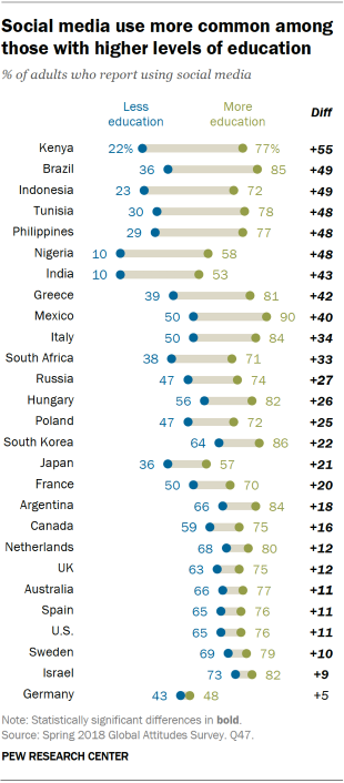 In advanced economies too, people with higher levels of education are more likely to use social media than those with lower levels of education. In these countries, generally around three-quarters of those with higher levels of education use social media, while fewer than two-thirds of those with lower levels of education do. In the UK, for instance, 75% of those with more than a secondary education use social media, compared with 63% of those with a secondary education or less.
