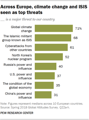 Across the 10 European countries surveyed, climate change and ISIS are clearly seen as major international threats, although a median of about half or more also name cyberattacks and North Korea’s nuclear program as top concerns.