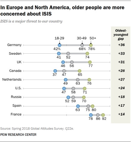 On the risk posed by ISIS, there are significant age divides in many of the countries surveyed. For example, in Germany, 78% of those ages 50 and older are worried about the ISIS threat, compared with only 42% among 18- to 29-year-old Germans.