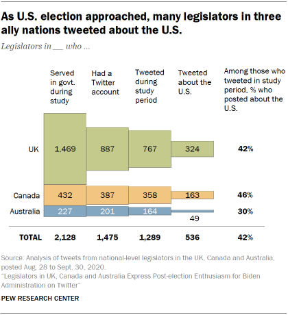 These are among the findings of a new Pew Research Center analysis of legislators on Twitter. The Center examined more than 160,000 tweets posted between Aug. 28 and Sept. 30, 2020, and 40,000 tweets posted Nov. 7-14, 2020, by national-level legislators representing Australia, Canada and the United Kingdom.