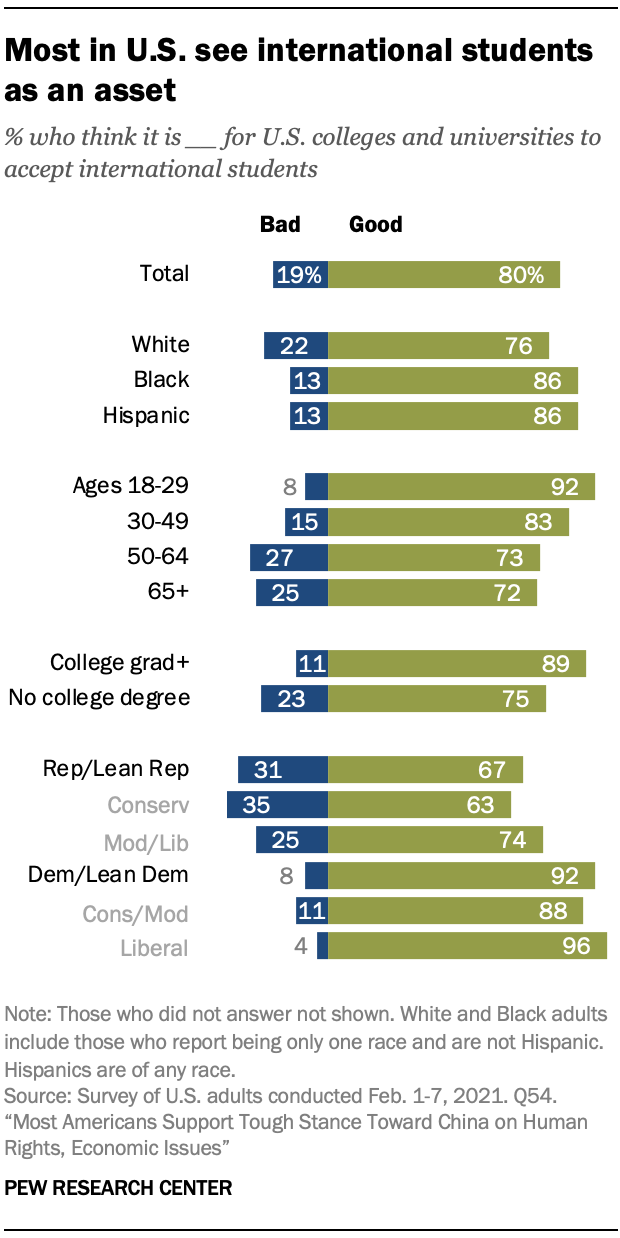 Although international student enrollment in the U.S. fell dramatically in 2020 because of COVID-19, during the 2019-202o school year, more than 1 million international students studied at U.S. colleges and universities, comprising 5.5% of all student enrollment in American tertiary education. And generally speaking, the U.S. public sees these students in a positive light: Eight-in-ten Americans say it is good for U.S. colleges and universities to accept international students, while just 19% think the opposite.