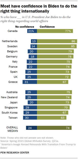 In the first year of his presidency, Biden enjoys positive ratings from majorities in each of the publics surveyed. Overall, a median of 74% have confidence in the U.S. president to do the right thing in world affairs.