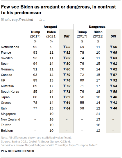 Very few people across the publics surveyed think Biden could be described as dangerous (median of 14%) or arrogant (median of 13%). This is a striking difference from how Trump was viewed early in his presidency.