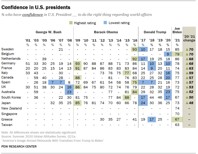 Germany is a good example of this pattern. In 2020, only 10% of Germans had confidence in Trump to do the right thing in world affairs (matching a previous all-time low earlier in Trump’s presidency). Once Biden took office, confidence in the U.S. president increased by 68 percentage points in Germany, but it is still lower there than the all-time high of 93% in 2009, Obama’s first year in office. A similar trend can be seen in Sweden, the Netherlands, France, Italy, Canada, Australia, South Korea and Japan.