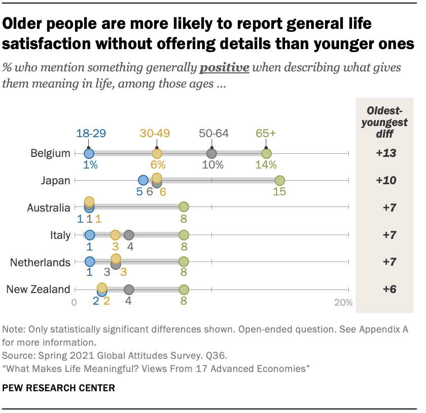 In some places surveyed, older people are more likely to respond in this general manner. In Belgium, for example, 14% of those ages 65 and older report satisfaction without details, compared with just 1% of those under 30. These age-related patterns sometimes emerge explicitly in the responses, such as with one Spanish man who noted, “I am content with what I have, I don’t aspire to further achievements at age 72.” Similarly, one Dutch man stated, “I live my life in a meaningful way, I find that’s very important. I am 70 years old and I’m still doing meaningful things.”
