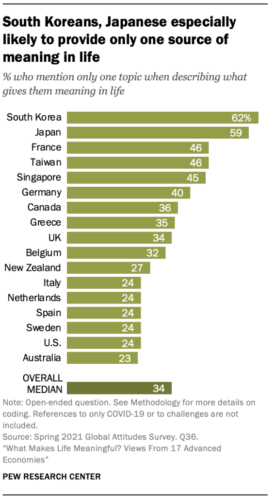 Whether due to mode, cultural, demographic or other factors, variation in response length ultimately manifests as variation in the number of topics mentioned in a given response. For example, across the 17 publics surveyed, a median of 34% responded to the question about what gives them meaning in life by mentioning only one of the topics researchers coded (e.g., family). But the share is particularly high in South Korea and Japan.