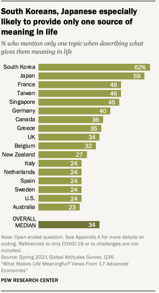 In some publics, people also tended to mention fewer things that make life meaningful in their response than did people surveyed elsewhere. For example, across the 17 publics surveyed, a median of 34% responded to the question about what gives them meaning in life by mentioning only one of the topics researchers coded (e.g., family). The shares in South Korea and Japan are much higher, with at least half only bringing up one source of meaning when providing a response.