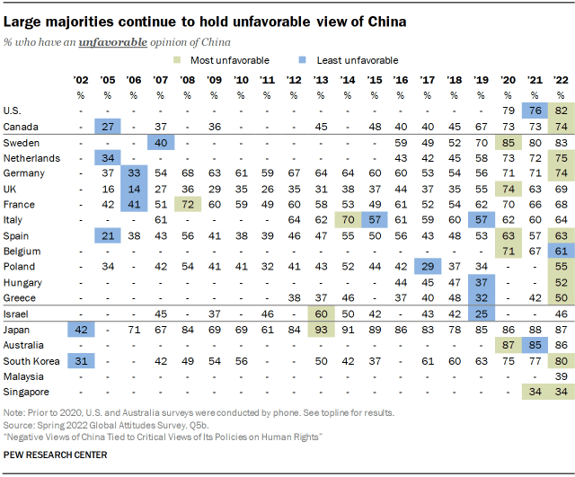 This Pew Research Center analysis focuses on public opinion of China in 19 countries in North America, Europe, the Middle East and the Asia-Pacific region. Views of China, its president, its bilateral relations and its policies on human rights are examined in the context of long-term trend data.