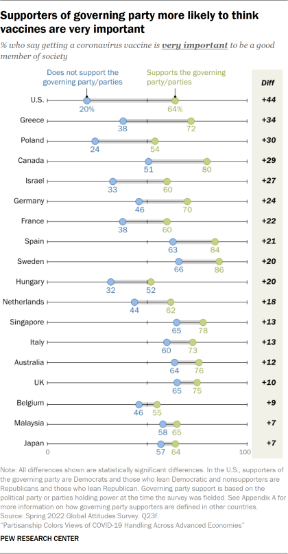 Partisan preferences also play a strong role in whether people think vaccination is crucial to be good members of society. In every nation, those who support the party or parties who are currently governing are much more likely to say it is very important to be vaccinated than those who do not support the ruling parties. This difference is largest in the U.S., where 64% of Democrats and Democratic-leaning independents think vaccines are very important, compared with 20% of Republicans and Republican-leaning independents.