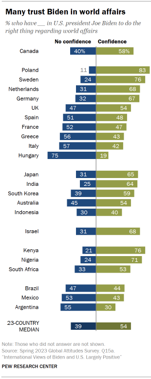 Ratings of Biden have not changed much since last year in most of the other countries surveyed, with a few exceptions. Israelis offer a somewhat more positive rating of the U.S. president now compared with 2022. But fewer people in France and South Korea trust Biden now compared with the previous year.