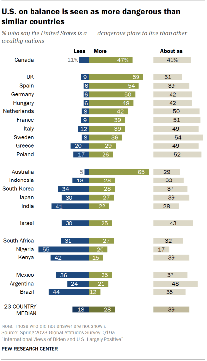 While a median of 39% say the U.S. is about as dangerous a place to live as other wealthy countries, those who believe differently are inclined to say it is more dangerous. For example, 47% of Canadians think the U.S. is a more dangerous place than comparable countries, while 11% say it is less dangerous.