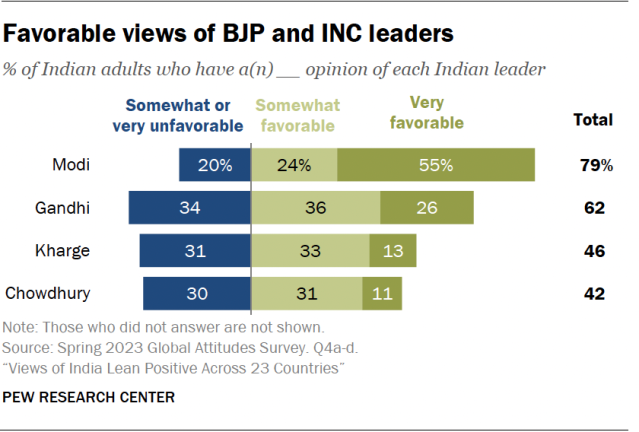About six-in-ten Indians also see opposition leader Rahul Gandhi of the Indian National Congress (INC) in a positive light. In contrast, 34% have an unfavorable view of the INC politician. The survey was conducted March 25 to May 11, starting just before Gandhi was removed from office on March 27 of this year after being conviction of defamation. He was recently reinstated.