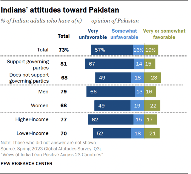 About seven-in-ten Indians have an unfavorable view of Pakistan, including 57% who are very unfavorable toward Pakistan. Just 19% in India have a favorable view of the neighboring country.
