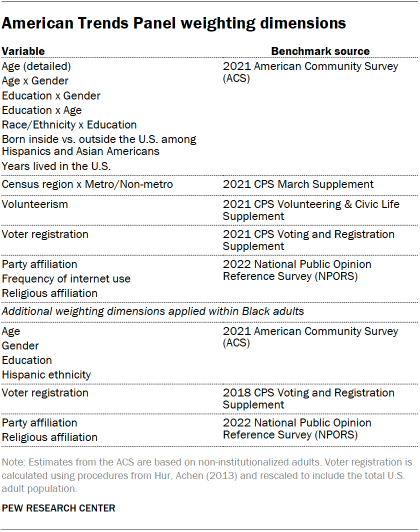 The ATP data is weighted in a multistep process that accounts for multiple stages of sampling and nonresponse that occur at different points in the survey process. First, each panelist begins with a base weight that reflects their probability of selection for their initial recruitment survey. These weights are then rescaled and adjusted to account for changes in the design of ATP recruitment surveys from year to year. Finally, the weights are calibrated to align with the population benchmarks in the accompanying table to correct for nonresponse to recruitment surveys and panel attrition. If only a subsample of panelists are invited to participate in the wave, this weight is adjusted to account for any differential probabilities of selection.