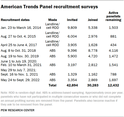 Across the five address-based recruitments, a total of 23,176 adults were invited to join the ATP, of whom 20,341 agreed to join the panel and completed an initial profile survey. In each household, one adult was selected and asked to go online to complete a survey, at the end of which they were invited to join the panel. Of the 30,283 individuals who have ever joined the ATP, 12,432 remained active panelists and continued to receive survey invitations at the time this survey was conducted.