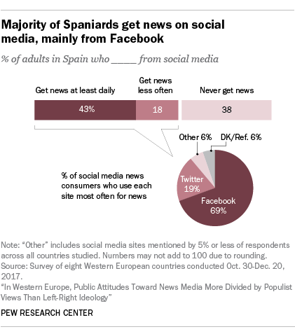 A majority of adults in Spain (61%) get news on social media, including 43% who get news on social media daily. Facebook is the most common social network used for news. In Spain, young people (those 18 to 29 years old) are more likely to get news on social media daily than those 50 and older (65% vs. 32%).
