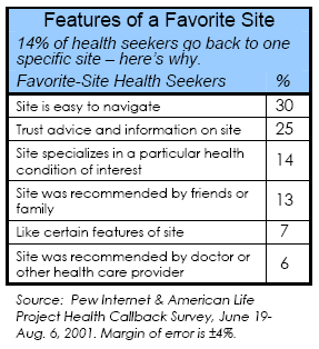 When asked if they have one favorite site, 14% of health seekers said yes. Of that small group, 35% named WebMD. Other sites named by these “favorite-site” health seekers include the Mayo Clinic site, the National Institutes of Health, InteliHealth, Medline, and DrKoop.com. One online focus group participant who is a fan of WebMD commented, “I know it so well it is just easier to go to it every time I have a question.”